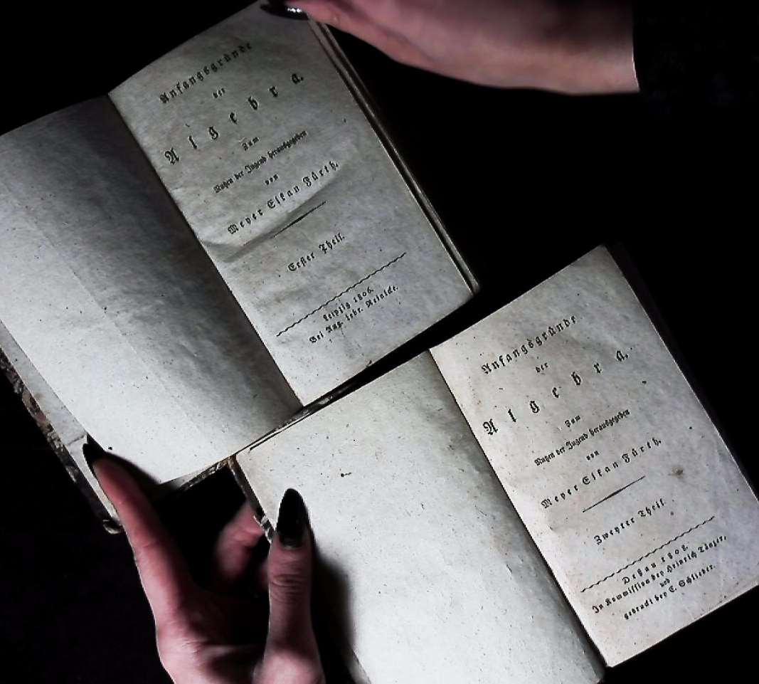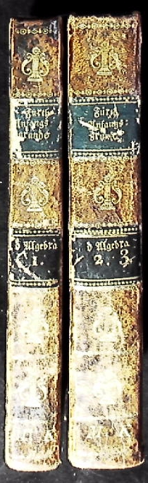 MATHEMATIK.– FÜRTH, Meyer Elkan: Anfangsgründe der Algebra. Zum Nutzen der Jugend hrsg. Mit einem Anhange von Verbesserungen und Zusätzen. 3 Theile in 2 Bänden. Dessau (Schlieder), 1806 – 1811. 8°. XII, 162, 46, 229, 186 S. HLdr der Zeit mit goldgeprägten Rücken. Kanten etwas beriebn, gutes Ex. seltene EA des Erstlings. Meyer Elkan Fürth war ein deutscher Schriftsteller und Lehrer, der der Schule der Me’assefim angehörte. Er kommentierte ein mathematisches Werk von Abraham Joseph Menz, das 1775 in Berlin erschienen war, und verfasste eine Reihe hebräischer und deutscher Werke. (Wikipedia)