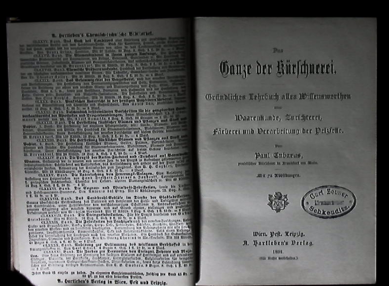 HANDWERK.– CUBAEUS, Paul: Das Ganze der Kürschnerei. Gründliches Lehrbuch alles Wissenswerthen über Waarenkunde, Zurichterei, Färberei und Verarbeitung der Pelzfelle. Wien, Pest, Leipzig (Hartleben), 1891. VIII, 416 S. mit 72 Abb. OLn mit Blindprägung. NaV, gutes Ex. = Chemisch-technische Bibliothek, 192. EA.