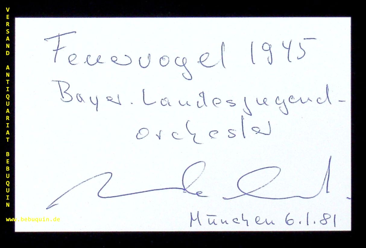 ALBERT, Werner Andreas (Dirigent): eigenhändig signierte und datierte Autogrammkarte: Feurvogel 1945. München (Herkulessaal), 6.1.1981. 8 x 10,5 cm. Karteikarte Werner Andreas Albert (* 10. Januar 1935 in Weinheim; † 10. November 2019 in Brisbane) war ein deutscher Dirigent. (Wikipedia)