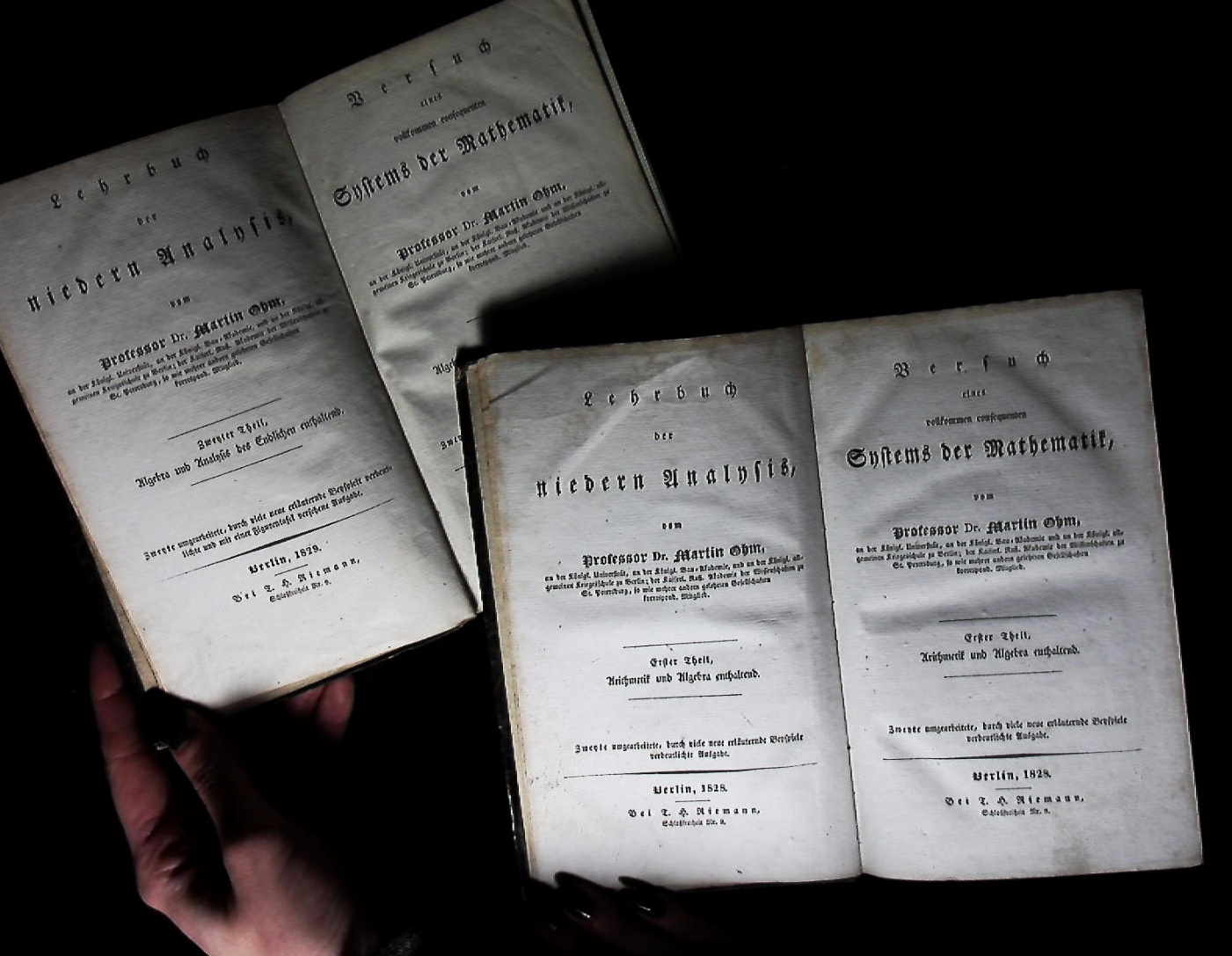 MATHEMATIK.– OHM, Martin: Versuch eines vollkommen consequenten Systems der Mathematik. 1: Arithmetik und Algebra. 2: Algebra und Analysis des Endlichen enthaltend. 2. umgearb., durch viele neue erl. Beyspiele verdeutl. Ausg. 2 Bände. Berlin (Riemann), 1828/29. XXXIV, 418, XX, 455 (2) S. mit einer Falttafel im Anhang. Pb der Zeit mit goldgeprägtem Rücken. Kanten etwas berieben, sonst gut erhalten. = Lehrbuch der niedern Analysis, 1. + 2. Theil. Martin Ohm (* 6. Mai 1792 in Erlangen; † 1. April 1872 in Berlin) war ein deutscher Mathematiker. (Wikipedia)