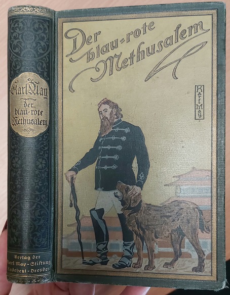 MAY, Karl: Der blaurote Methusalem. Eine lustige Studentenfahrt nach China. (16.– 22. Tsd.) Radebeul (Karl May Stiftung), (1914). 2 Bl., 569 S., 1 Bl. farb. ill. OLn. mit goldstrahlendem Rücken. Schnitt und hinterer Vorsatz etwas angeschmutzt, Ecken leicht berieben, sonst sehr feines Ex. = Gesammelte Werke, Bd. 40.