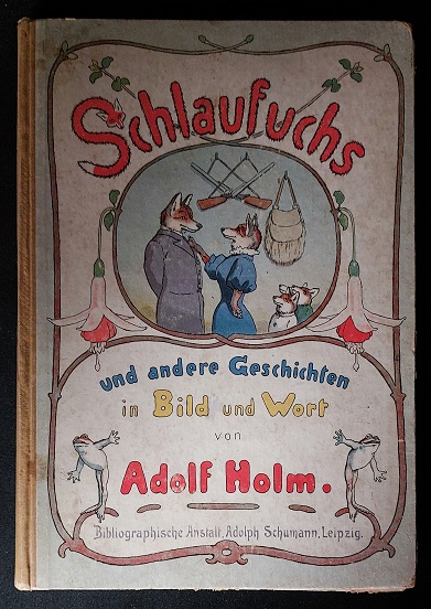 HOLM, Adolf: Schlaufuchs und andere Geschichten in Bild und Wort. Leipzig (Schumann), 1900. 4°. 40 S. mit zahlr. farb. Bildern des Verfassers. farb. ill. OHLn. Einband bestaubt, sonst gut erhalten. seltene EA. (Nicht bei Ries 604) Holm bevorzugte wie hier humoristische Tiergeschichten.