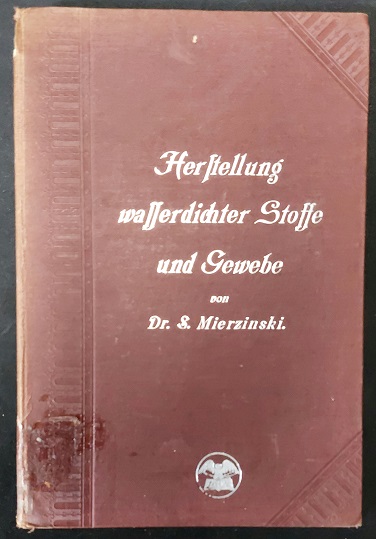 CHEMIE.– MIERZINSKI, Stanislaus: Herstellung wasserdichter Stoffe und Gewebe. Auf sogenanntem chemischem Wege. Berlin (Krayn), 1897. Gr. 8°. 119 S. mit 29 Illustrationen sowie einem bebilderten Werbeanhang und eigenhändige Aufzeichnungen und einem Brief der chemischen Firma Königswarter & Ebell aus Hannover Linden. OLn mit Silberprägung. oberes Kap lädiert, NaT, StaT. EA mit inhaltsreichen Aufzeichnungen von 1900.