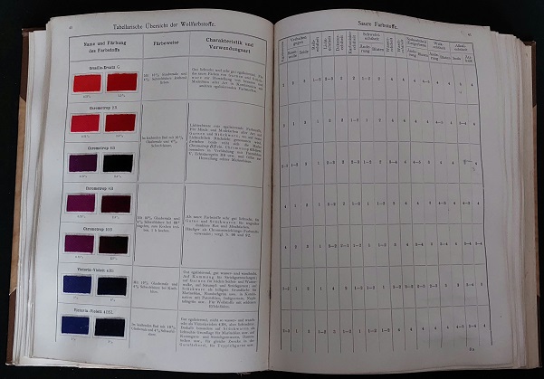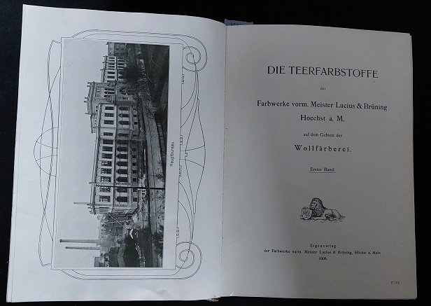 MUSTERBÜCHER.– FARBWERKE VORM. MEISTER LUCIUS & BRÜNING: Die Teerfarbstoffe auf dem Gebie der Wollfärberei. 1. Band. Höchst (Farbwerke vorm. Meister Lucius & Brüning), 1908. 4°. 201 S. mit zwei Frontispizen der Farbwerke und des Hauptbüros sowie 47 Tafeln mit jeweils 16 genauestens beschriebenen Wollstoffproben. OHLdr mit goldgeprägtem Rücken. EA. Farbwerke Hoechst AG, vorm. Meister, Lucius & Brüning – in Frankfurt am Main war eines der drei größten Chemie- und Pharmaunternehmen Deutschlands. Es wurde 1863 im damals nassauischen Höchst am Main gegründet und wuchs bis zum Ersten Weltkrieg zu einem Weltunternehmen. (Wikipedia)