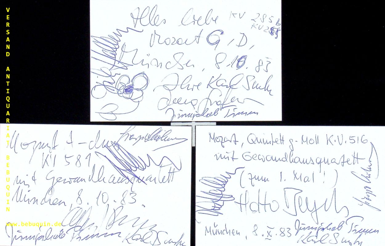 GEWANDHAUS QUARTETT.– GRAFENAUER, Irena (Flöte) + PRINZ, Alfred (Klarinette) + BEYERLE, Hatto (Bratsche) + SUSKE, Karl + KRÖHNER, Giorgio + HALLMANN, Dietmar + TIMM, Jürnjakob. 3 eigenhändig von allen signierte und datierte Autogrammkarten. Dachau (Schloß), 8.10.1983. 8 x 12,5 cm. 3 Karteikarten.