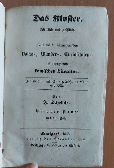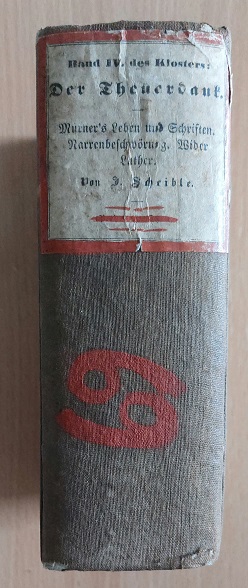 GRENZWISSENSCHAFTEN.– SCHEIBLE, Johann (Hrsg.): Der Theuerdank nach der Ausgabe von 1519. Thomas Murner’s Schriften und sein Leben, nebst dessen Narrenbeschwörung und der Spottschrift: Ob der König von England ein Lügner sey oder der Luther. 13 bis 16 Zelle. Stuttgart, 1846. kl. 8°. 4 Bl., 982 Seiten, 1 Bl., 32 Bl. mit 118 Holzschnitten und mit 96 Abbildungen. HLn der Zeit mit Rückenschild. Rücken mit roter Zahl, Kanten leicht bestoßen, insgesamt gut. = Das Kloster : Weltlich und geistlich; Meist aus der ältern deutschen Volks-, Wunder-, Curiositäten-, und vorzugsweise komischen Literatur; zur Kultur- und Sittengeschichte in Wort und Bild / 4. Bd. EA. Johann Scheible (* 9. Juli 1809 in Ulm; † 15. August 1866 in Stuttgart) war ein deutscher Verleger, Herausgeber und Antiquar.