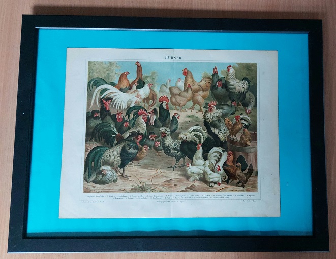 FARBLITHOGRAPHIE.– HÜHNER (ORNITHOLOGIE).– Original Chromolithographie von 1896 in stilvollem Kunstglasrahmen mit schwarzem Rand. Aus: Meyers Konversations Lexikon. 5. Aufl. Leipzig (BI), 1896. Abbildungsgröße 30 x 24 cm. Rahmengröße 43 x 33 cm. Schönes dekoratives Blatt mit Mittelfalz. leicht bestaubt, insgesamt gut erhalten – siehe Foto. Mit folgenden Vogelabbildungen: Englischer Kampfhahn, Malaien, Jokahama, Kochinchina, Breda, Brahmaputra, Creve coeur, La fleche, Dorking, Hondan, Italiener, Spanier, Brabanter, Poland, Strupphahn, Goldbantam, Weiße, Seidenhaar, Zwerghühner. Die Chromolithographie ( farbiger Steindruck ) erlebte ihre höchste technische Blüte um 1900. Ihre Farbkraft wird von keinem anderen Druckverfahren erreicht. Der Farbdruck von Steinen wird heute nicht mehr verwendet und darf als eine ausgestorbene, historische Drucktechnik angesehen werden. Die farbigen „Chromos“ gelten heute als kulturgeschichtliche und drucktechnische Kostbarkeiten und sind begehrte Sammlerobjekte.