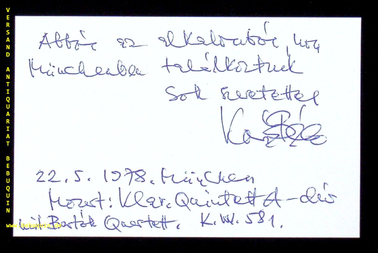 KOVACS, Bela (Klarinettist, Komponist): eigenhändig signierte Autogrammkarte. München (Philharmonie), 22.5.1978. 8 x 12,5 cm. Karteikarte. Béla Kovács (* 1. Mai 1937 in Tatabánya) ist ein ungarischer Klarinettist und Komponist. (Wikipedia)