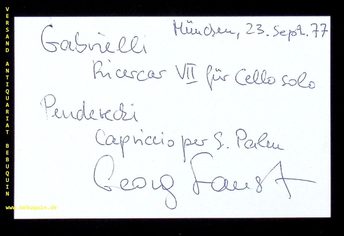 FAUST, Georg (Cellist): eigenhändig signierte und datiere Autogrammkarte. München (Herkulessaal), 23.7.1977. 8 x 12,5 cm. Karteikarte.