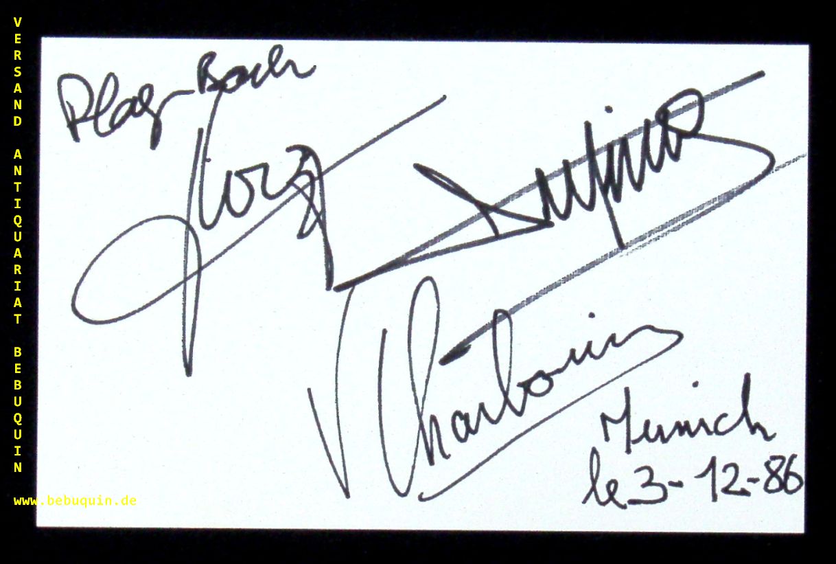 LOUSSIER, Jacques + MICHELOT, Pierre + GARROS, Christian: eigenhändig von allen drei Mitgliedern des Play Bach Trios signierte und datierte Autogrammkarte: Play Bach. München (Herkulessaal), 3.12.1986. 8 x 12,5 cm. Karteikarte. Jacques Loussier (* 26. Oktober 1934 in Angers; † 5. März 2019 in Blois) war ein französischer Pianist, Komponist und Arrangeur. Bekannt wurde er mit seinen verjazzten Interpretationen von Werken Johann Sebastian Bachs. Auf diese ungewöhnliche Kombination war Loussier 1959 während seines Studiums gestoßen und gründete dazu mit dem Bassisten Pierre Michelot und dem Schlagzeuger Christian Garros das Play Bach Trio. (Wikipedia)
