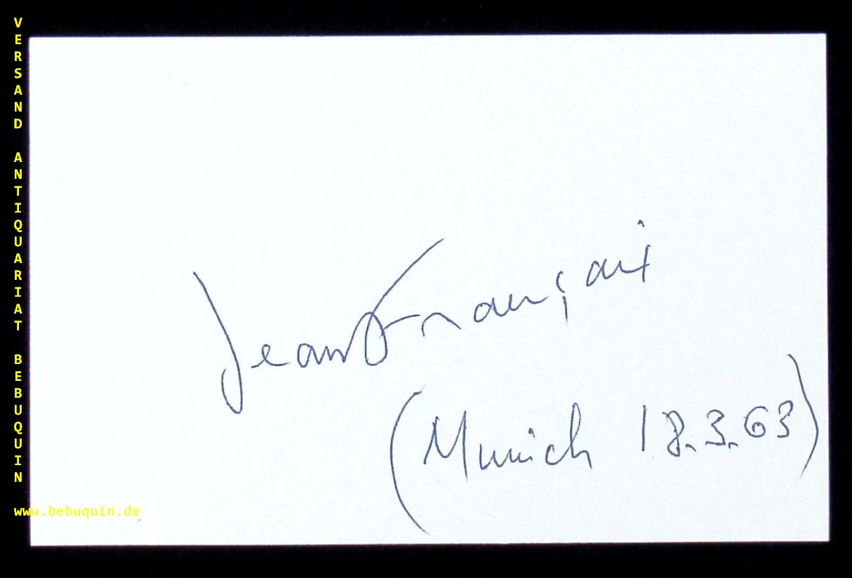 FRANCAIX, Jean (Komponist): eigenhändig signierte und datierte Autogrammkarte. München (Philharmonie), 18.3.1963. 8 x 12,5 cm. Karteikarte. Jean Françaix (* 23. Mai 1912 in Le Mans als Jean René Désiré Françaix; † 25. September 1997 in Paris) war ein französischer Komponist. Er war auch ein Klaviervirtuose, allerdings widmete er seine Schaffenskraft hauptsächlich seiner kompositorischen Tätigkeit. Seine Werke sind originell, witzig, rhythmisch komplex, die Harmonien sind einfach. Er prägte den Begriff „Höllenorchester“ für eine Instrumentengruppe, die sich durch einen lauten, monströsen und „schnarrenden“ Klangeindruck auszeichnet. So wurden dieser Gruppe unter anderen Fagott, Klarinette, E-Gitarre, Pauken, Schlagwerk und Akkordeon zugeordnet. (Wikipedia)