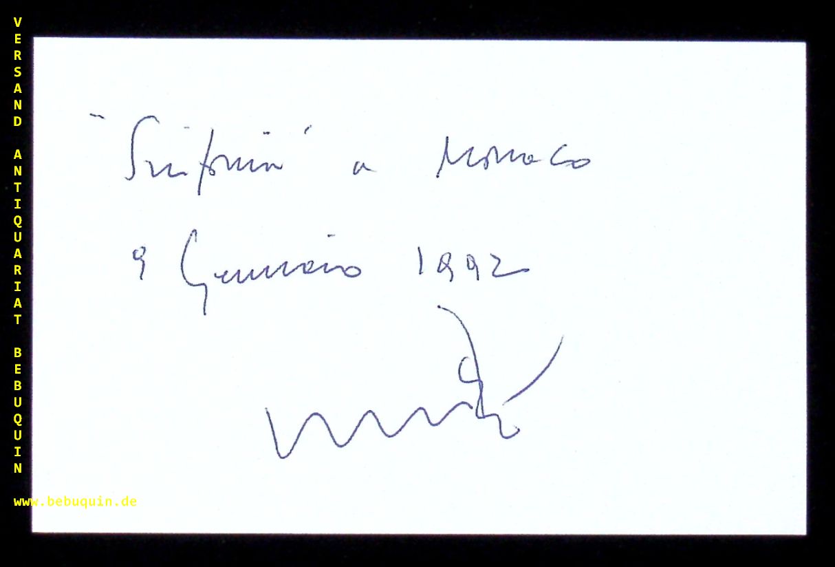 BERIO, Luciano (Komponist, Dirigent): eigenhändig signierte und datierte Autogrammkarte. München (Herkulessaal), 9.1.1992. 8 x 12,5 cm. Karteikarte. Luciano Berio (* 24. Oktober 1925 in Oneglia; † 27. Mai 2003 in Rom) war ein italienischer Komponist, bekannt für seine experimentellen Kompositionen und als einer der Pioniere der elektronischen Musik. (Wikipedia)