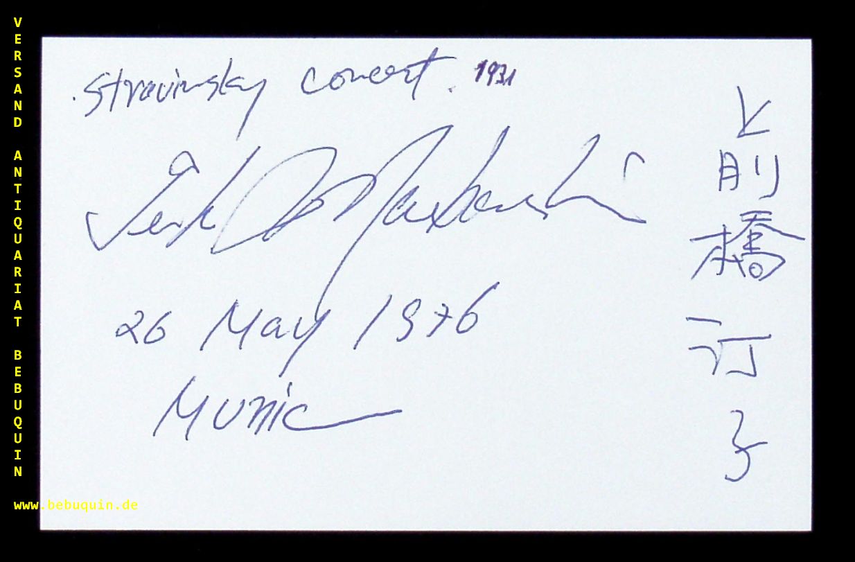 MAEHASHI, Teiko (Violinistin): eigenhändig zweisprachig signierte und datierte Autogrammkarte. München (Philharmonie), 26.5.1976. 8 x 12,5 cm. Karteikarte. Born in Tokyo, Teiko MAEHASHI started her violin lesson with Anna Ono at the age of 5 and later studied with Hideo Saito at TOHO Senior High School. At 17, she was chosen as the first Japanese exchange student in Soviet Union National Leningrad Conservatory (today’s St Petersburg State Conservatory) as a part of celebrating the 100th anniversary of its foundation and had studied with Michael Vaiman for three years. After her graduation, she moved to New York to study at the Juilliard School under Robert Mann and Dorothy DeLay, and later, to Switzerland to be trained by Joseph Szigeti and Nathan Milstein.
