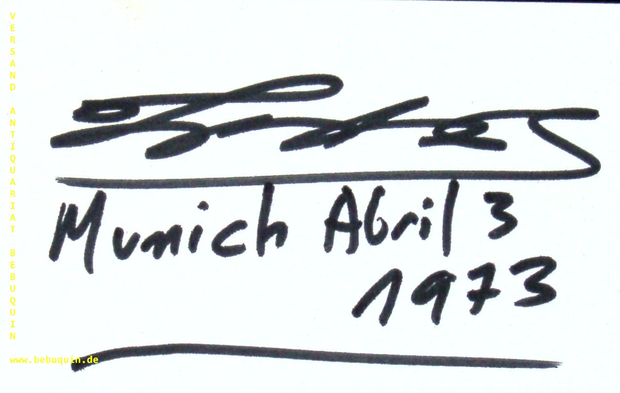 YEPES, Narciso (Gitarrist): eigenhändig signierte und datierte Autogrammkarte. München, 3.4.1973 Karteikarte. Narciso García Yepes (* 14. November 1927 in Lorca; † 3. Mai 1997 in Murcia) war ein spanischer klassischer Gitarrist, Lautenist, Arrangeur und Komponist. Mit Andrés Segovia und Miguel Llobet gehört er zu den größten Gitarristen Spaniens. Er spielte auf einer zehnsaitigen Gitarre, welche er mit dem Gitarrenbauer José Ramírez III entwickelte. 1952 arrangierte er die Musik zum Oscar-prämierten Film Verbotene Spiele (Jeux interdits). (Wikipedia)