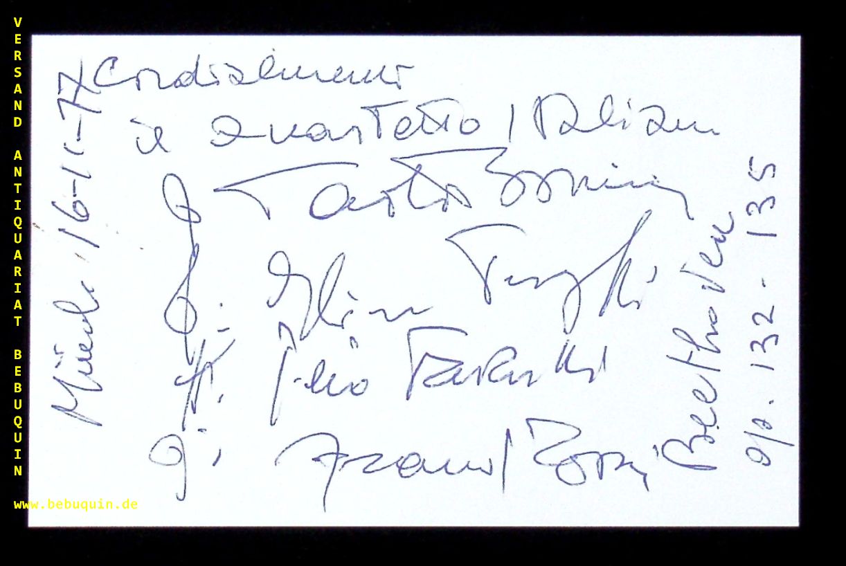 QUARTETTO ITALIANO.– BORCIANI, Paolo + PEGREFFI, Elisa + ROSSI, Franco + FARULLI, Piero: eigenhändig von allen signierte Autogrammkarten. München (Herkulessaal), 24.1.1979. 8 x 12,5 cm. Karteikarte. Das Quartetto Italiano war ein italienisches Streichquartett, das über drei Jahrzehnte immer in der gleichen, 1947 gefundenen Formation spielte. Nur in den letzten Jahren kam es 1977 nochmals mit Dino Asciolla zu einer Neubesetzung, der an Farullis Stelle trat. Mit dem Tod des Primargeigers Paolo Borciani im Jahre 1985 löste sich das Quartetto Italiano auf. (Wikipedia)