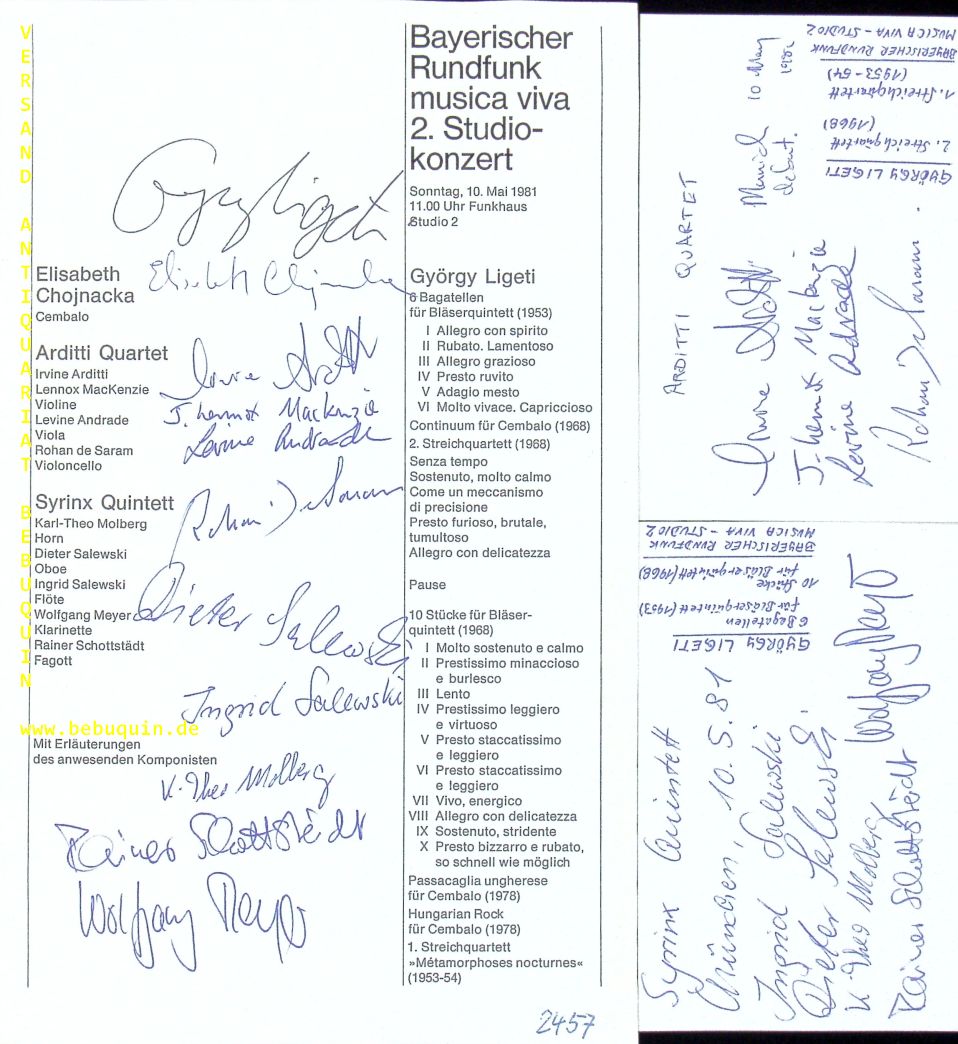 LIGETI, György (Komponist) + CHOJNACKA, Elisabeth + ARDITTI + MACKENZIE + ANDRADE + DE SARAM + MOLBERG + SALEWSKI, Dieter und Ingrid + MEYER + SCHOTTSTÄDT: eigenhändig von allen signierte und datierte Programmseite + 2 eigenhändig von allen signierte und datierte Autogrammkarten mit den beteiligten Musikern des Arditti und Syrinx Quartetts. München (Philharmonie), 10.5.1981. 26 x 16 cm. 1 Bl. + 2 Karteikarten. György Sándor Ligeti (Georg Alexander Ligeti; * 28. Mai 1923 in Diciosânmartin, Siebenbürgen, Königreich Rumänien; † 12. Juni 2006 in Wien) war ein österreichisch-ungarischer Komponist. Er gilt als einer der bedeutenden Komponisten des 20. Jahrhunderts und als Repräsentant der Neuen Musik. (Wikipedia). Elzbieta Chojnacka (* 10. September 1939 in Warschau; † 28. Mai 2017 in Paris) war eine polnische Cembalistin und Musikpädagogin. Rainer Schottstädt (* 21. Januar 1951 in Stuttgart; † 19. September 2016) war ein deutscher Fagottist, Professor und Verleger.