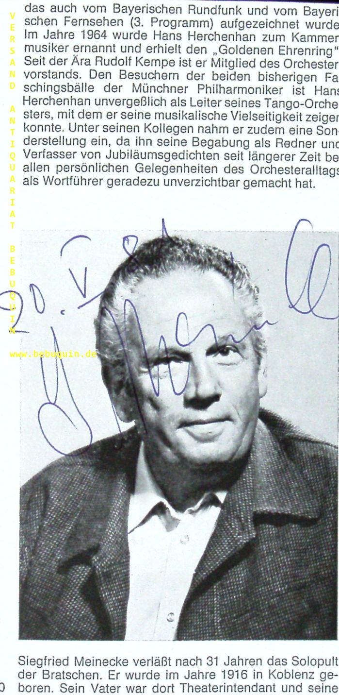 MEINECKE, Siegfried (Bratschist): eigenhändig signierte und datierte Portraitseite. München (Philharmonie), 20.5.1981. 18 x 9 cm. 1 Bl. Siegfried Meinecke (13 January 1916 – 30 November 2015) was a German violist and music professor. (Wikipedia)