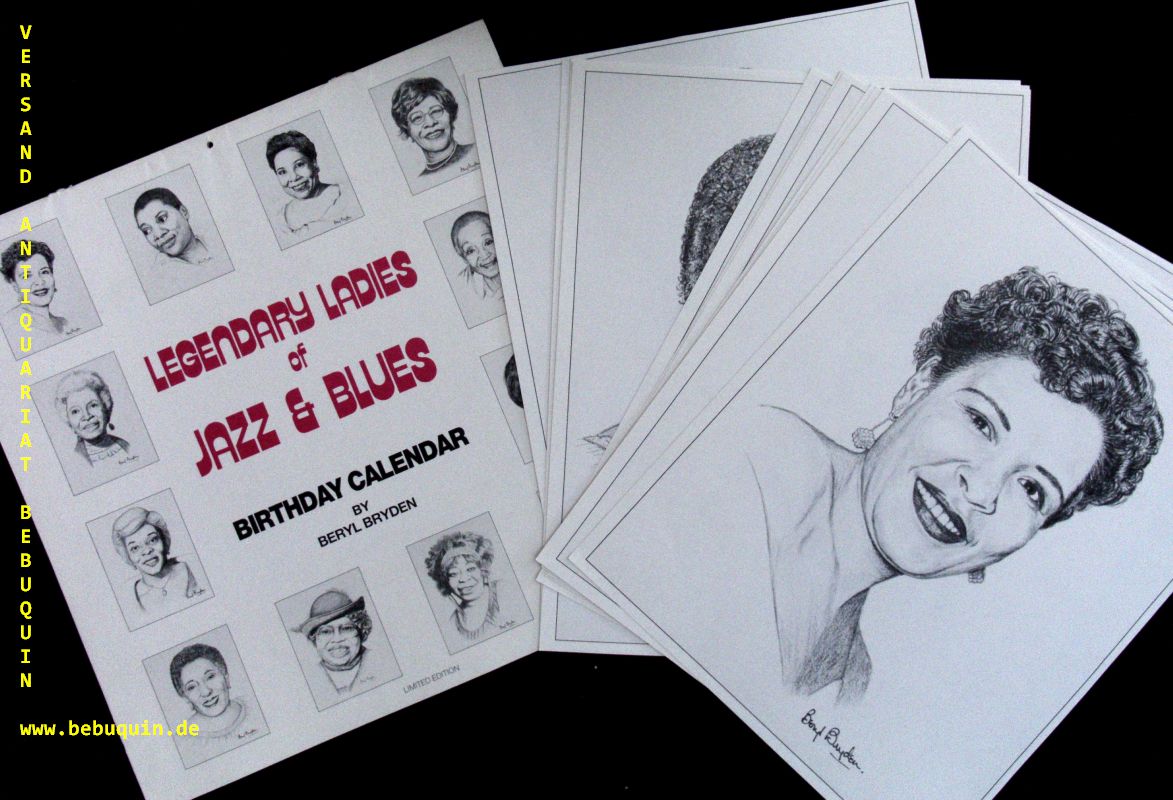 JAZZ.– BRYDEN, Beryl: Legendary Ladies of Jazz & Blues. Birthday Calendar. London (Walkerprint), ca 1970. 4°. 12 Bl. nach Kohlezeichnungen der berühmtesten Jazzfrauen in der Größe 28 x 22 cm. in ill. OKartMappe. Die Blätter sind rückseitig handschriftlich mit dem Namen des jeweils dargestellten beschrieben. Die Waschbrettspielerin und Sängerin Beryl war auch eine begabte Zeichnerin, die viele „Giants of Jazz“, allen voran ihre großen Idole Louis Armstrong und Bessie Smith, mit dem Kohlestift verewigte; ihre „birthday calendars“ sind ebenso wie ihre zahlreichen Schallplatten begehrte Sammlerstücke geworden. Die letzte „Red Hot Mama“ oder „Britains Queen of the Blues“, wie sie auf der Insel genannt wurde, begann ihre Laufbahn 1945 mit „George Webb’s Dixielanders“, damals noch „non-professional“. Ihren erlernten Beruf als Sekretärin gab sie auf, als ihre Stimme immer gefragter wurde, und im Lauf der Jahre folgten Auftritte mit allen Größen vor allem des europäischen traditionellen Jazz, wie Chris Barer, Monty Sunshine, Alex Welsh oder Fatty George, um nur einige zu erwähnen.