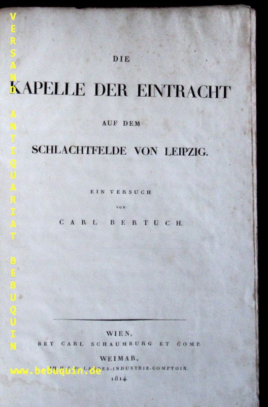 LEIPZIG.– BERTUCH, Carl: Die Kapelle der Eintracht auf dem Schlachtfelde von Leipzig. Ein Versuch. Wien, Weimar (Schaumburg, Landes-Industrie-Comptoir), 1814. Fol. 7 S. + 1 Kupferstichtafel. OPb mit schwarzgeprägter Schrift. Einband am Rand angeschmutzt, innen nur leicht stockig, insgesamt von überraschend guter Erhaltung.
