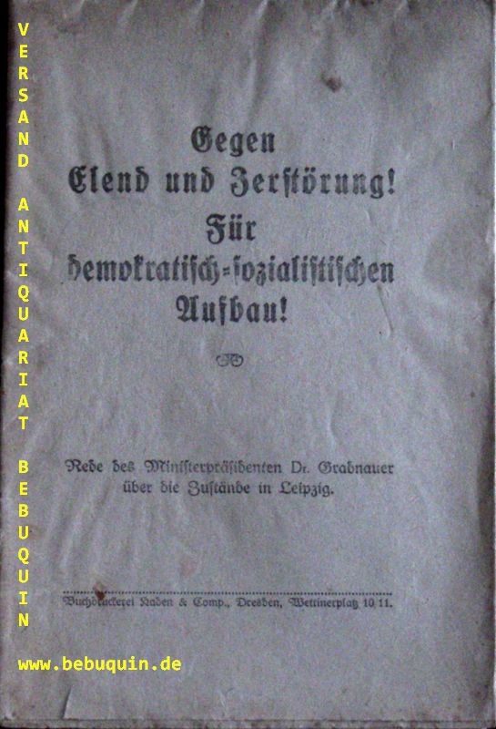 LEIPZIG.– GRADNAUER, Georg: Gegen Elend und Zerstörung! Für demokratisch-sozialistischen Aufbau. Rede des Ministerpräsidenten über die Zustände in Leipzig. Dresden (Kaden), (1919). Gr. 8°. 30 S. OKart. unaufgeschnitten, Rücken etwas eingerissen, insgesamt in hervorragender Erhaltung. EA von größter Seltenheit. Dokument der Räterepublik und der Situation in Deutschland nach dem ersten Weltkrieg.