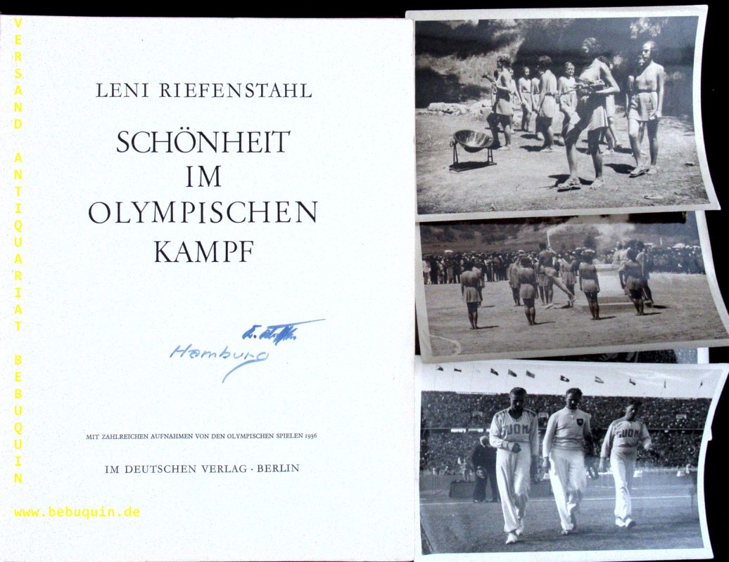 RIEFENSTAHL, Leni: Schönheit im olympischen Kampf. 2. Aufl. Berlin (Deutscher), 1937. Gr. 4°. 281 S. mit 273 Bildtafeln. OLn mit goldgeprägtem Titel. Kanten berieben, NaT, vorderes Gelenk etwas gelockert. inliegend 2 x „Illustrierter Film-Kurier Nr. 1963“ und 5 original Pressefotos der Olympiade 1936 von Hoffmann / Berlin.