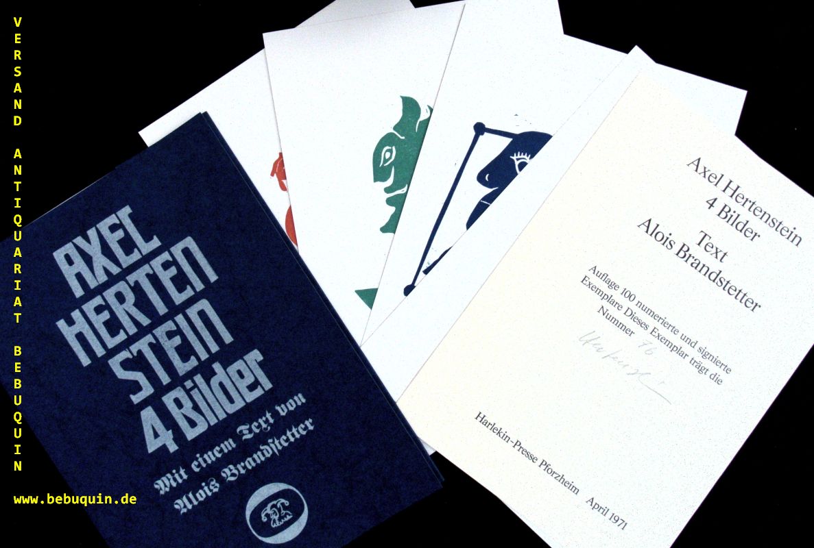 PRESSENDRUCKE.– BRANDSTETTER, Alois: 4 Bilder. Pforzheim (Harlekin-Presse), 1971. 4°. 2 Bl. + 4 eigenhändig numerierte und signierte farb. Linolschnitten von Axel Hertenstein. ill. OKart. tadellos. Nr. 76 von 100 Ex. der EA mit der eigenhändigen Signatur von Künstlers auf Titelseite.