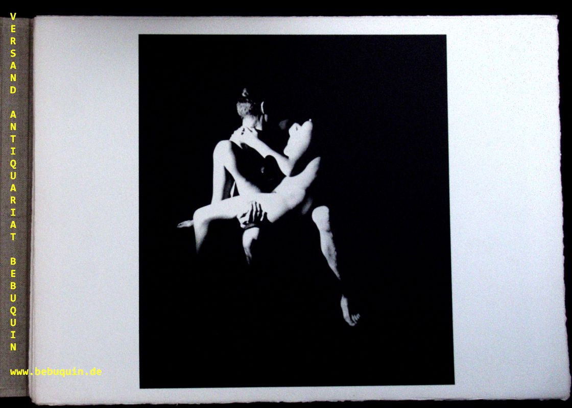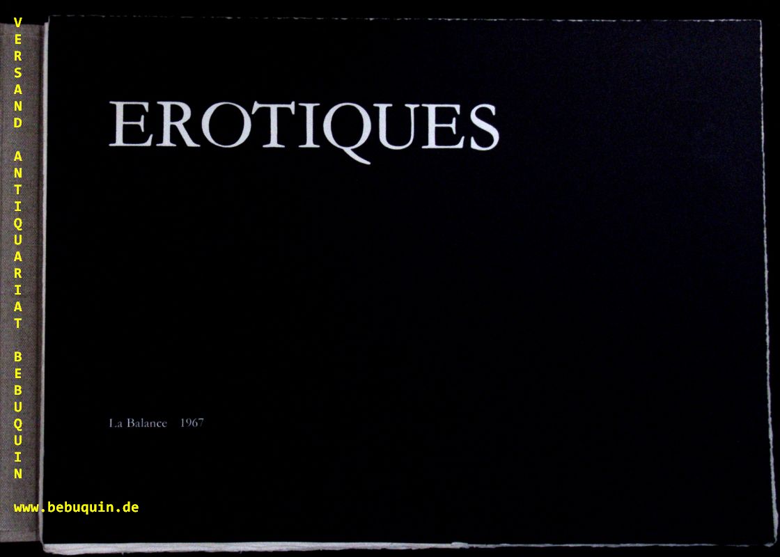 EROTIK.– JOUSSON, Pierre: Erotiques. o.O. (Balance), 1967. Quer Fol. 1 feuillet de titre, 37 planches photographiques très contrastées sur fond noir montrant un homme et une femme dans une variété de positions voluptueuses. OLnMappe in OSchuber. gutes Ex. Ces photographies sont accompagnées de 6 planches de vers libres de Louise Labé et Pierre de Ronsard, et d’un feuillet imprimé en blanc sur noir : „Cet ouvrage confidentiel a été tiré à quelques exemplaires pour des amis“ auf Büttenpapier.