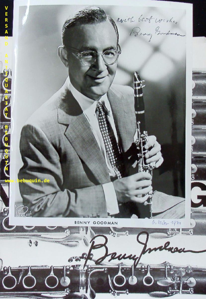 JAZZ.– GOODMAN, Benny (Klarinettist): eigenhändig voll signiertes Großfoto „With best wishes“. München (Dallhammer), 6.3.1971. 25 x 21 cm. 1. Bl. in Programmheft der „Benny Goodman Story“. 6 Bl. mit zahlr. Bildern. ill. OKart. schönes Heft.