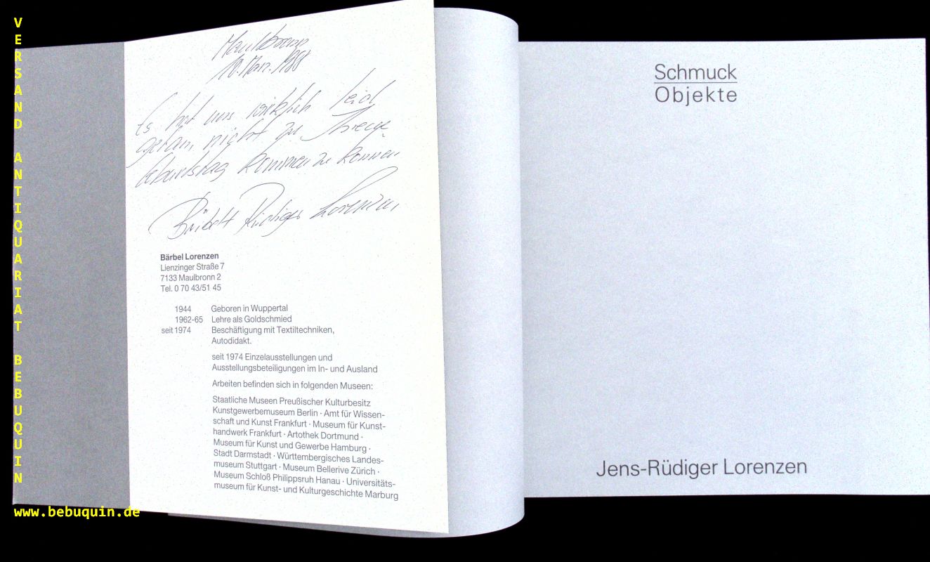 LORENZEN, Jens-Rüdiger: Schmuck-Objekte. Ausstellungskatalog. Nürnberg (Kunsthalle), 1982. Gr. 8°. 17 S. als Blockbuch gebunden mit überwiegend farb. Ill. OKart. tadellos. Nr. 997 von 1200 signierten und nummerierten Ex. mit einer zusätzlichen eigenhändigen Mitteilung seiner Frau Bärbel Rüdiger auf einer Einladungskarte inliegend. Jens-Rüdiger Lorenzen führte das Skulpturale im Schmuck, den er selbst so gerne als „Seelenzeichen“ bezeichnete, mit ganz eigener, bildhauerischer Qualität zur Meisterschaft. Lorenzens Schmuckstücke sind miniaturhafte Skulpturen am Körper mit plastischer Wirkung.