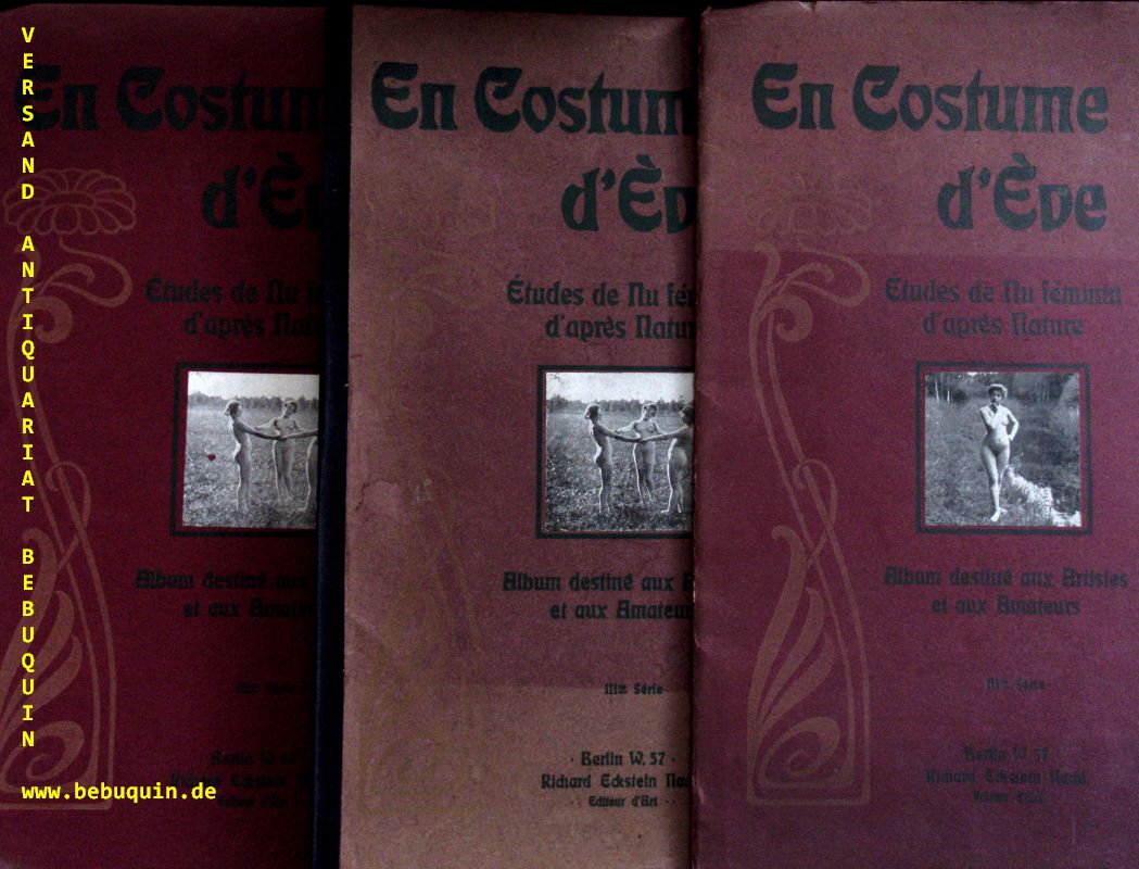 EROTIK.– ECKSTEIN, R.: En Costume d’Eve. III. Serie. Etudes de Nu Féminin d’après Nature. Album destiné aux artistes et aux amateurs. Berlin (Eckstein), 1905. Fol. 2 Bl. Text + 19 (von 20) mont. Fototafeln. 3 (!) ill. OLnMappen mit mont. Fotos. es fehlt Tafel 16, sonst in guter Erhaltung. EA der 3. Mappe.