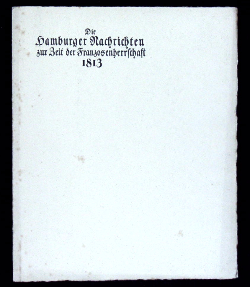 HARTMEYER, Hans: Die Hamburger Nachrichten zur Zeit der Franzosenherrschaft 1813. Hamburg (Alster), September 1927. 4°. 2 ungezählte Blätter, 2 ungezählte Seiten, 2, 2, 4, 4 Seiten, 1 ungezähltes Blatt. OKart. gutes Ex. Nr. 212 von 300 numerierten Ex.