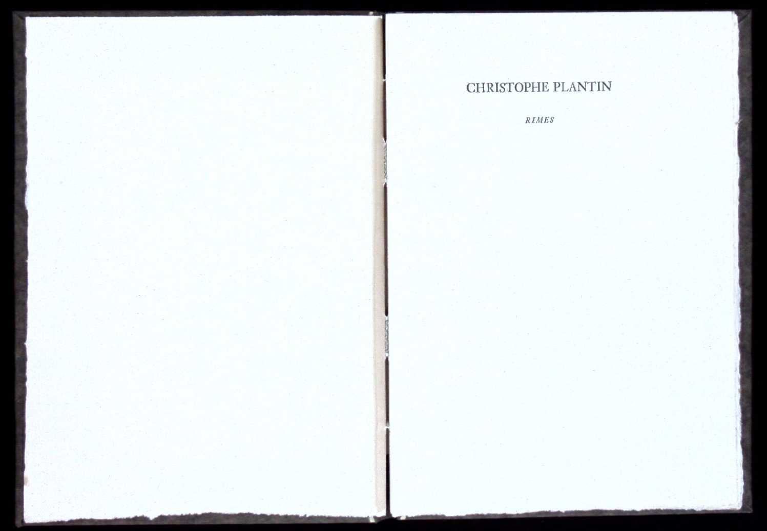 PLANTIN, Christophe: Rimes. Hamburg (Weitbrecht), 1926. 4°. 10 Bl. OPb mit OUmschl. gutes Ex. = Für die Mitglieder der Maximilian Gesellschaft zu ihrer Hauptversammlung am 28.XI.26 in Berlin im Auftrage von Alfred Simon gedruckt. EA.