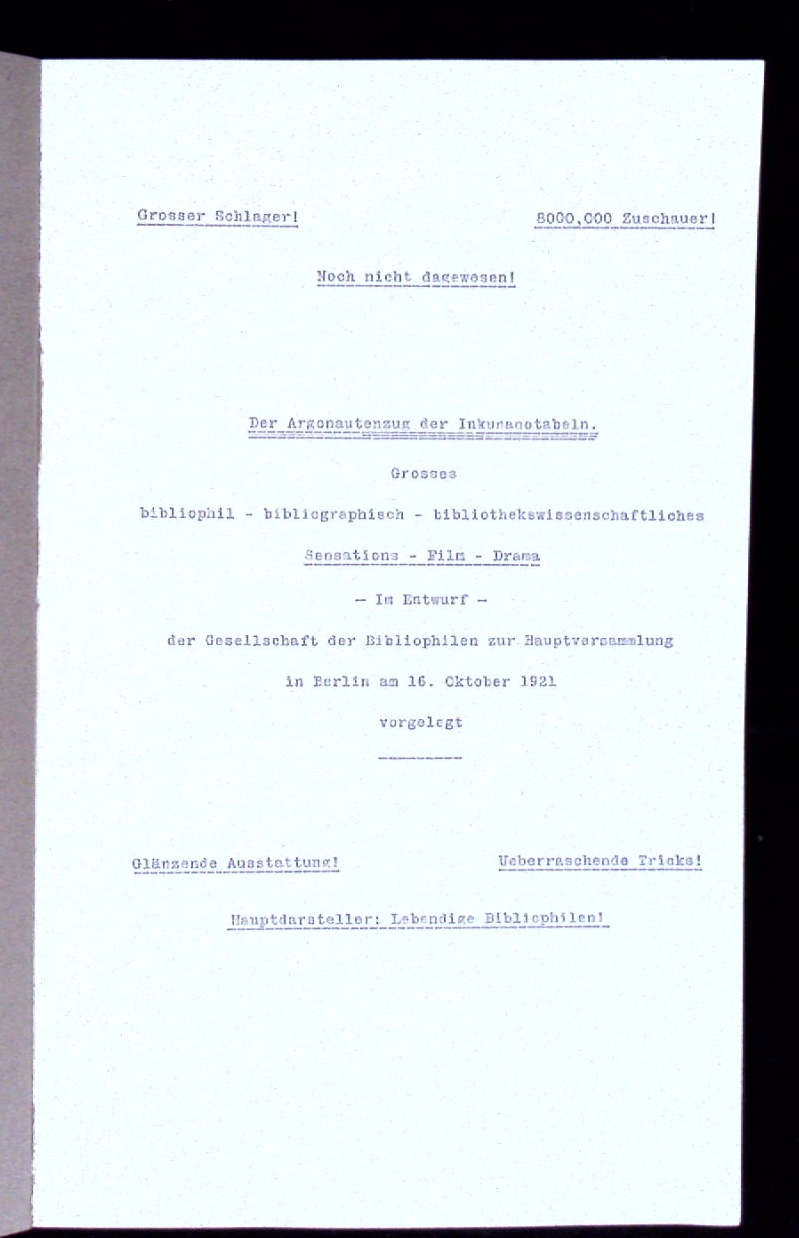 ZOBELTITZ, Fedor von + BRESLAUER, Martin: Der Argonautenzug der Inkunanotabeln. Grosses bibliophil-bibliographisch-bibliothekswissenschaftl. Sensations-Film-Drama. Berlin, (Hoffmann & Co), 1921. 4°. 13 einseitig bedruckte Bl. eigenhändig mit „Kurbelreifes Film-Maniskrpt“ beschrifteter OKart. Kapitale leicht eingerissen, sonst tadellos. = Im Entwurf der Gesellschaft der Bibliophilen zur Hauptversammlung in Berlin am 16. Okt. 1921 vorgelegt. Nr. 139 von 300 gezählten Stücken der höchst raren EA WG² 99. Martin Breslauer (geboren 16. Dezember 1871 in Berlin; gestorben 16. Oktober 1940 in London) war ein deutscher Buchantiquar. (Wikipedia)