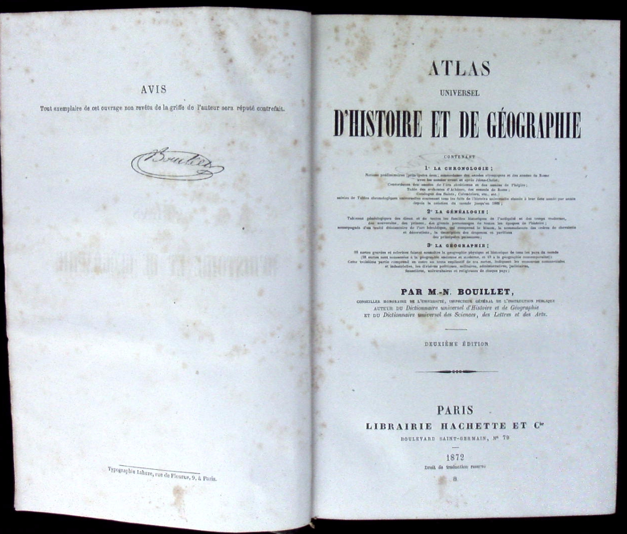 ATLANTEN.– BOUILLET, Marie Nicolas: (Hrsg.) Atlas universel d’histoire et de géographie. 2. éd. Paris (Hachette), 1872. 1035 S., XII + 88 doppelblattgroße farbblithogr. Karten und 10 farb. doppelblattgroße Bildtafeln. HLdr der Zeit mit goldgeprägtem Rücken. nur vereinzelt etwas gebräunt bzw. stockfleckig, insgesamt schönes Ex. Mit der eigenhändigen Signatur des Herausgebers am Druckvermerk.