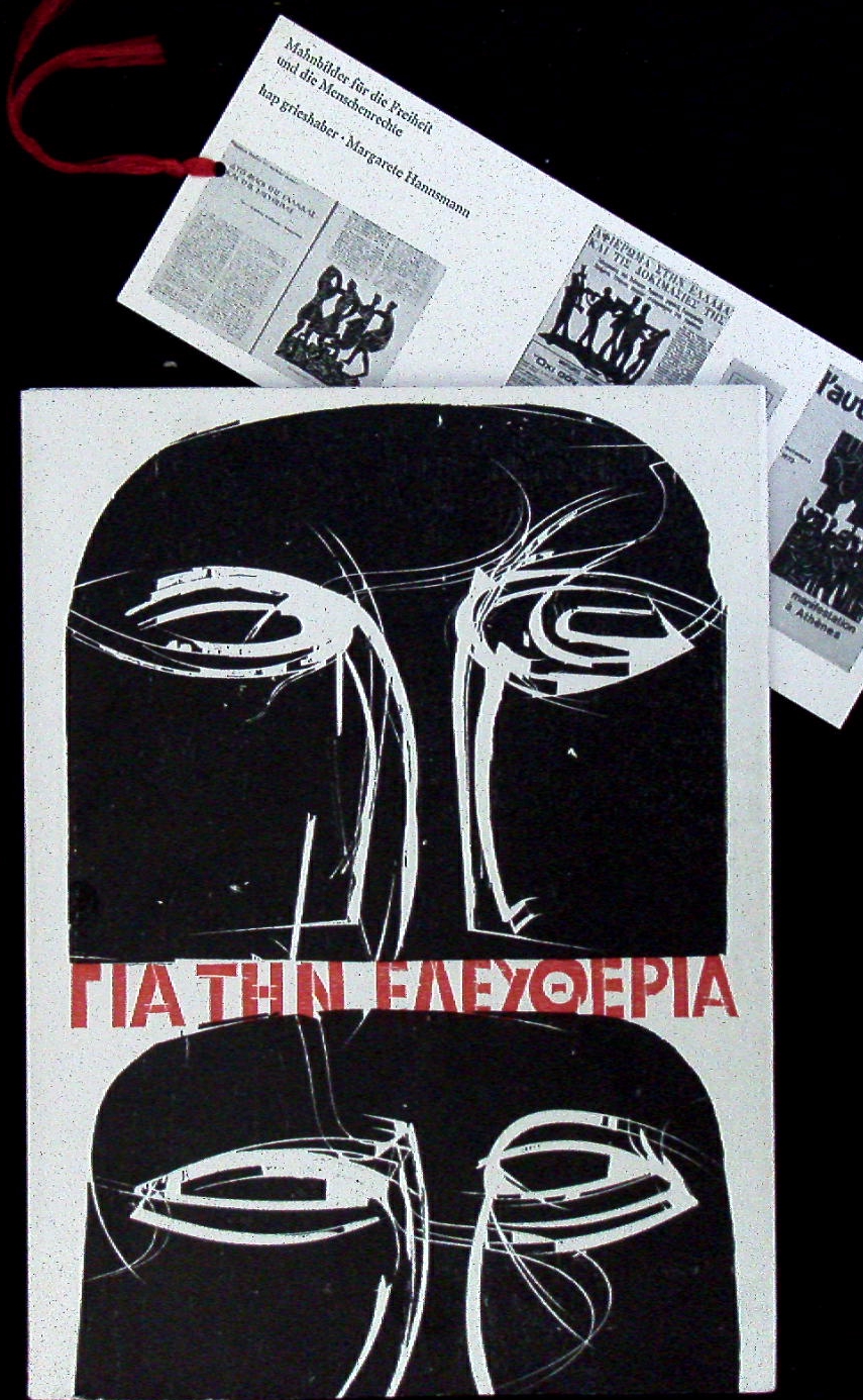 HANNSMANN, Margarete. Griechenland lädt Grieshaber ein. HAP Grieshaber zeigt im Kulturzentrum d. Stadt Athen vom 16. – 31. März 1977 Mahnbilder für die Freiheit und die Menschenrechte. Stuttgart, Galerie Valentien, 1977. 4°. 86 S. mit 27 einfarbigen und 14 zweifarbigen Holzschnitten Griehabers vom Stock gedruckt. ill. OKart mit zweifarb. Holzschnitt vom Stock gedruckt. feines Ex. 1 von 2500 Ex. der EA.
