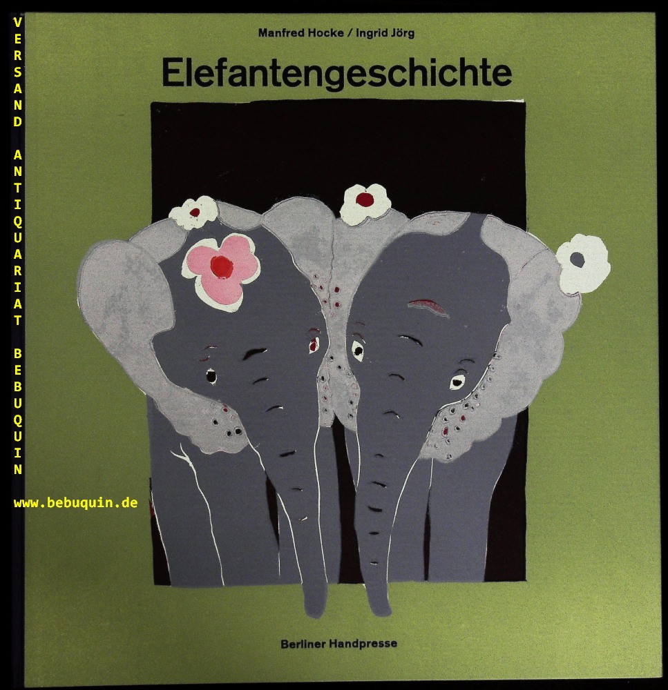 JÖRG.– HOCKE, Manfred: Elefantengeschichte. Berlin (Berliner Handpresse), 1992. 34,5 x 33,5 cm. 22 (2) S. mit 7 achtfarbigen Original-Linolschnitten von Ingrid Jörg. farb. ill. OHLn. tadellos. = Berliner Handpresse, 83. Druck. Nr. 19 von 100 nummerierten und von der Künstlerin eigenhändig signierten Ex. dieser Auflage.