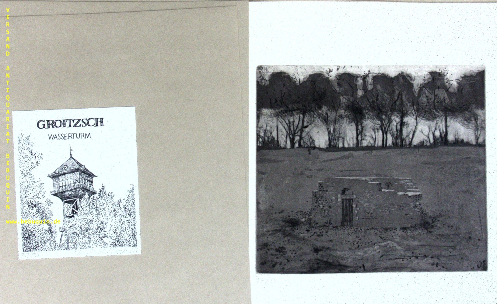 GROITZSCH.– BÖTTCHER, Brigida: Groitzsch. Hrsg. von der Schuhfabrik „Bella“. Groitzsch, 33,5 x 30 cm. OMappe mit Titelblatt und 5 eigenhändig signierten Radierungen und 5 eigenhändig signierten Offsetlithographien von Brigida Böttcher. in blindgeprägter OHLnMappe. Die Mappe etws angeschmutzt, die Blätter selbst tadellos. Nr. 37 von 50 Ex. der Erstausgabe.
