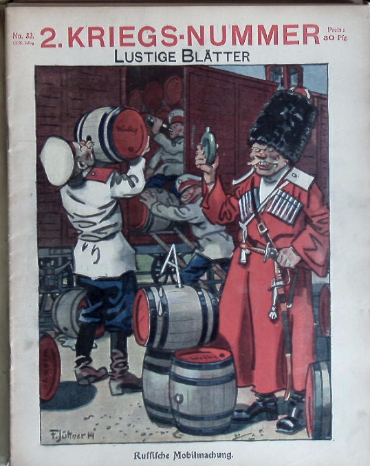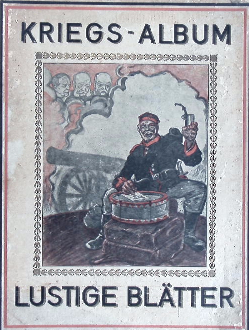 KARIKATUR.– KRIEGS-ALBUM.– Lustige Blätter XXIX. Jahrgang, Kriegs-Nummern 1-18 (= normale Nr. 32-49). Berlin (Eysler), 1914. Fol. 18 Hefte mit ca 280 S. mit 20 ganzseit. farbigen und 27 s/w Zeichnungen von Walter Trier, dazu sehr viele Illustrationen anderer Künstler. farb. ill. OUmschl. in OSchuber. Schuber am Rand lädiert, die Hefte nur in der Bindung leicht gelockert, insgesamt gut. Erste Ausgabe. – Unter den Illustrationen auch drei Bilderfolgen Triers. – Neuner-W. Abb. 123 u. 128. Vgl. Hatry 18-24 (nur Einzelblätter).