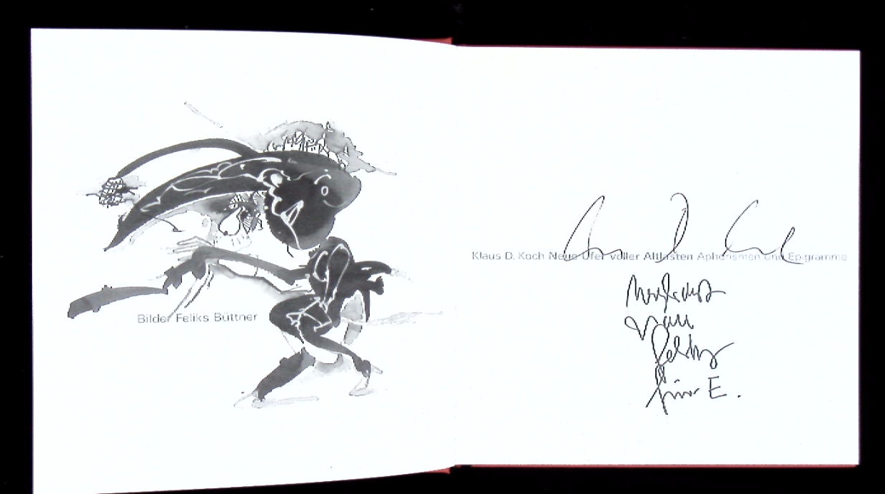 KOCH, Klaus D. Neue Ufer voller Altlasten. Aphorismen und Epigramme. Limitierte Sonderausg. Bremen/Rostock, (Temmen), 2000. 84 S. mit zahlr. Bildtafeln von Gerd Max Lippmann. ill. OPb. gutes Ex. 1 von 600 Ex. der EA mit einer eigenhändigen signierten Widmung des Verfassers auf Titelseite.