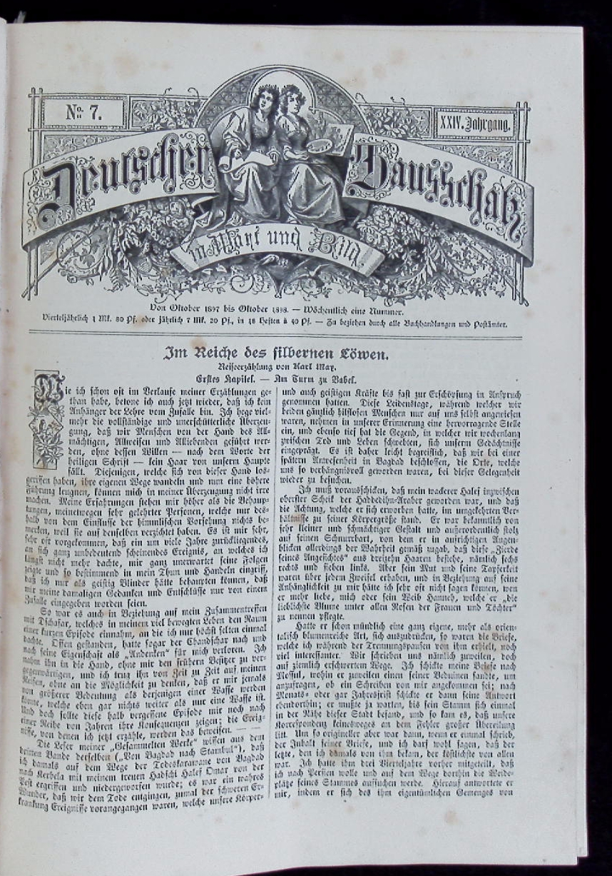 MAY, Karl: Im Reiche des silbernen Löwen. Reiseerzählung. In: Deutscher Hausschatz in Wort und Bild. 2 Bände. Regensburg (Pustet), 1896/97 + 1897/98. 4°. ca 2000 S. mit zahlreichen Holzstichen und Extra-Beilagen wie „Für die Frauenwelt“ sowie „Aus der Zeit für die Zeit“ u.a. mit zahlr. Abb.. HLdr der Zeit mit goldgeprägten Rücken (23) und ill. OLn mit Goldprägung (24). Band 24 am Rücken etwas angeplatzt und am Ende nicht ganz lagenkonform gebunden sowie am Rücken mit 25 wohl verlagsseitig falsch bedruckt, insgesamt gutes Ex. = 23. + 24. Jg.