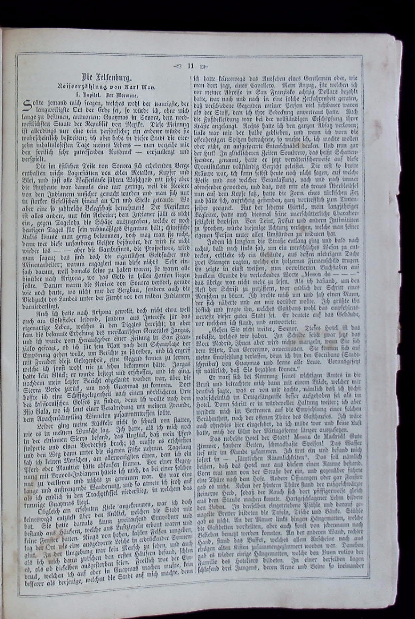 MAY, Karl: Die Felsenburg. Reiseerzählung. In: Deutscher Hausschatz in Wort und Bild. Regensburg (Pustet), 1893/94. Gr. 4°. 4 Bl., 824 S. mit zahlreichen Holzstichen sowie 72 S. „Für die Frauenwelt“. ill. OHLn mit reicher Goldprägung. etwas schief gelesen und gelockert, vereinzelt braunfleckig, sonst gut. = 20. Jg. EA. Plaul 248.