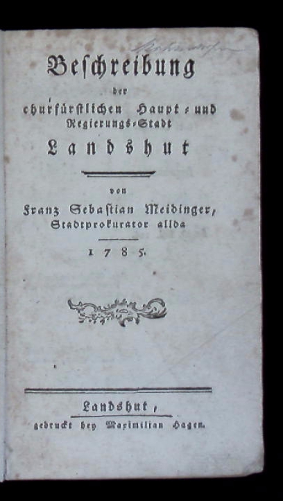 LANDSHUT.– MEIDINGER, Franz Sebastian: Beschreibung der churfürstlichen Haupt- und Regierungs-Stadt. Vom Stadtprokurator allda. Landshut (Hagen), 1785. kl. 8°. 253 S., 1 Bl. mit gestochenem Buchschmuck. Pb der Zeit. Einband mit Buntpapierüberzug, oberes Kap mit Fehlstelle, Papier teils fingerspurig