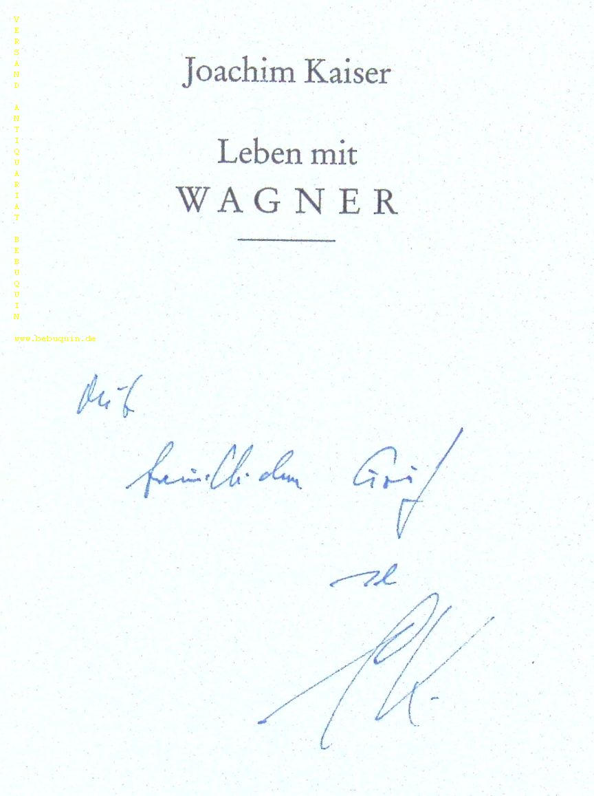 KAISER, Joachim: Leben mit Wagner. 2. Aufl. München (Knaus), 1990. 350 S. OLn mit OUmschl Mit einer eigenhänidgen monogrammierten Verfasserwidmung auf Titelseite.