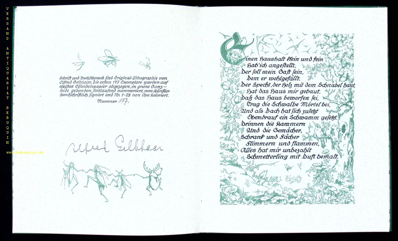 GELBHAAR.– RÜCKERT, Friedrich: Kleiner Haushalt. Meißen (Truhe), (1921). Gr. 8°. 4 Bl. mit 8 Originallithographien von Alfred Gelbhaar. ill. OSeideneinband. Ecken und Kanten minimal berieben, sehr schönes Ex. Nr. 157 von 175 Ex. der EA, vom Künstler signiert und nummeriert gebunden in grüner Ganzseide.
