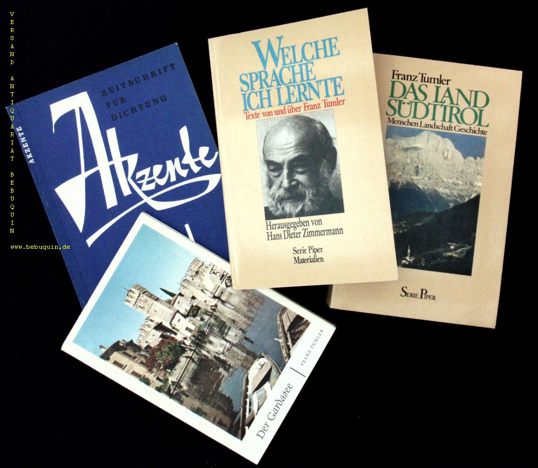 TUMLER, Franz: 4 Widmungsexemplare an Kurt Bösch und 1 Brief. 1. Welche Sprache ich lernte. 2. Das Land Südtirol. 3. Das Gardasee. 4. Über die Ladiner. 4 Bände. München u.a. (Piper u.a.), 1959 – 1986. zusammen ca 1000 S. OKart. gute Ex. Jeweils mit ausführlicher eigenhändiger und datierterWidmung an den Bibliophilen Kurt Bösch. Dabei ein einseitiger mascheinenschrifftlicher und eigenhändig signierter Brief an denselben mit persönlichen Nachrichten. Fünfteiliges Konvolut für zusammen