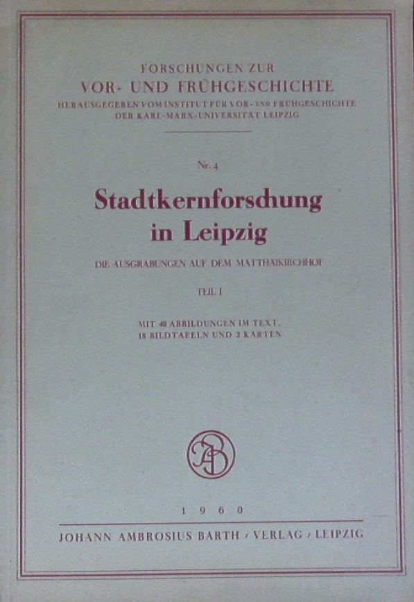 LEIPZIG.– STADTKERNFORSCHUNG IN LEIPZIG.– Die Ausgrabungen auf dem Matthaikirchhof. Leipzig (Barth), 1960. Gr. 8°. 111 S. mit 40 Abb. im Text, 18 Bildtaf. und 2 Ktn. in Rückenschlaufe. OKart. Kap gering bestoßen, sonst gutes Ex. = Forschungen zur Vor- und Frühgeschichte, Nr. 4. EA.