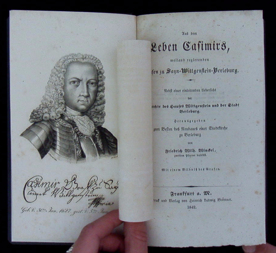 BERLEBURG.– WINCKEL, Friedrich Wilhelm: Aus dem Leben Casimirs, weiland regierenden Grafen zu Sayn-Wittgenstein-Berleburg. Nebst einer einleitenden Uebersicht der Geschichte des Hauses Wittgenstein und der Stadt Berleburg. Frankfurt a. M. (Brönner), 1842. VIII, 177 S. mit portrait Frontisp. neues HLn. Papier kaum gebräunt, fein restauriertes Ex. EA. Casimir zu Sayn-Wittgenstein-Berleburg (* 31. Januar 1687 in Berleburg; † 5. Juni 1741 ebenda) war regierender Graf von Wittgenstein-Berleburg. Er war ein bedeutender Bauherr und ließ Schloss Berleburg barock ausbauen. Außerdem gründete er mehrere Höhendörfer im Gebiet der heutigen Stadt Winterberg. Er war pietistisch geprägt und war ein großer Förderer des Übersetzungsprojekts der Berleburger Bibel. Er war tolerant und bot verfolgten religiösen Personen Zuflucht. Infolgedessen wurde die Grafschaft zu einem Zentrum der Radikalpietisten und kirchlichen Separatisten. (Wikipedia)