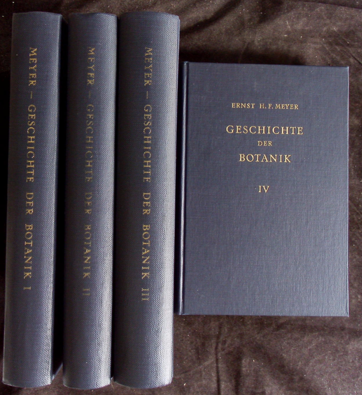 BOTANIK.– MEYER, Ernst Heinrich Friedrich: Geschichte der Botanik. Studien. Nachdr. der Ausg. Königsberg 1854 – 1857. 4 Bände. Amsterdam (Asher), 1965. 406, X, 430, XVI, 554, VIII, 451 S. OLn mit Goldprägung Vorsätze minimal braunfleckig, sonst tadellos. Ernst Heinrich Friedrich Meyer, Botaniker, geb. zu Hannover den 1. Januar 1791, † zu Königsberg in Preußen den 7. August 1858. Durch eine Recension in den Göttinger gelehrten Anzeigen über die Metamorphose der Pflanzen erregte Meyer Goethe’s Aufmerksamkeit, dessen Einfluß er es verdankte, daß er im April 1826 als außerordentlicher Professor der Botanik an die Universität Königsberg berufen wurde. Sein Hauptwerk ist die „Geschichte der Botanik“. Der erste Band erschien 1854 und behandelt die ersten Anfänge dieser Wissenschaft unter den Griechen, ihre Blüthe, ihren Verfall und ihre Weiterentwicklung unter den Römern bis zur Zeit des Kaisers Augustus. Der zweite Band. 1855 publicirt, führt die Entwicklung fort bis zur Zeit Karls des Großen, während der dritte sehr umfangreiche Band, welcher 1856 herauskam, die Geschichte der botanischen Wissenschaft bis in die dunkeln Fernen der asiatischen Völkerschaften verfolgt, bei Indern, Persern und Nabathäern anfängt und sie bis zur Herrschaft der Araber im vierzehnten Jahrhundert weiter leitet. Der zweite Abschnitt dieses Bandes schildert im elften Buche die neuen, auf die Botanik bezüglichen Geistesregungen in den christlicheuropäischen Ländern vom Jahre 800 bis zu dem Mönche Albert dem Großen. Endlich behandelt der vierte, 1857, ein Jahr vor dem Tode des Verfassers herausgekommene Band, die Geschichte bis zu den deutschen Vätern der Pflanzenkunde im 16. Jahrhundert. (Deutsche Biographie 1885)