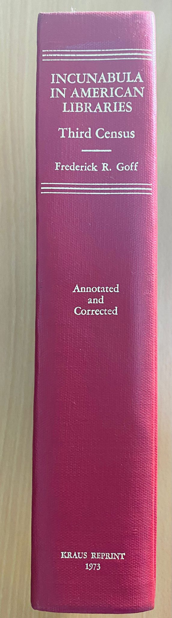 INKUNABELN.– GOFF, Frederick Richmond: Incunabula in American libraries. A third census of 15.-century books recorded in North American collections. Reprod. from the annotated copy maintained by Frederick R. Goff., comp. and ed. (Additional materials and corrections, 1973.) Millwood (Kraus), 1973. Gr. 4°. LXIII, 798 S. OLn mit goldgeprägtem Rücken. Schnitt leicht stockig, eine Ecke etwas gestaucht, über und über mit Anmerkungen wohl von der Hand des Verfassers versehen.