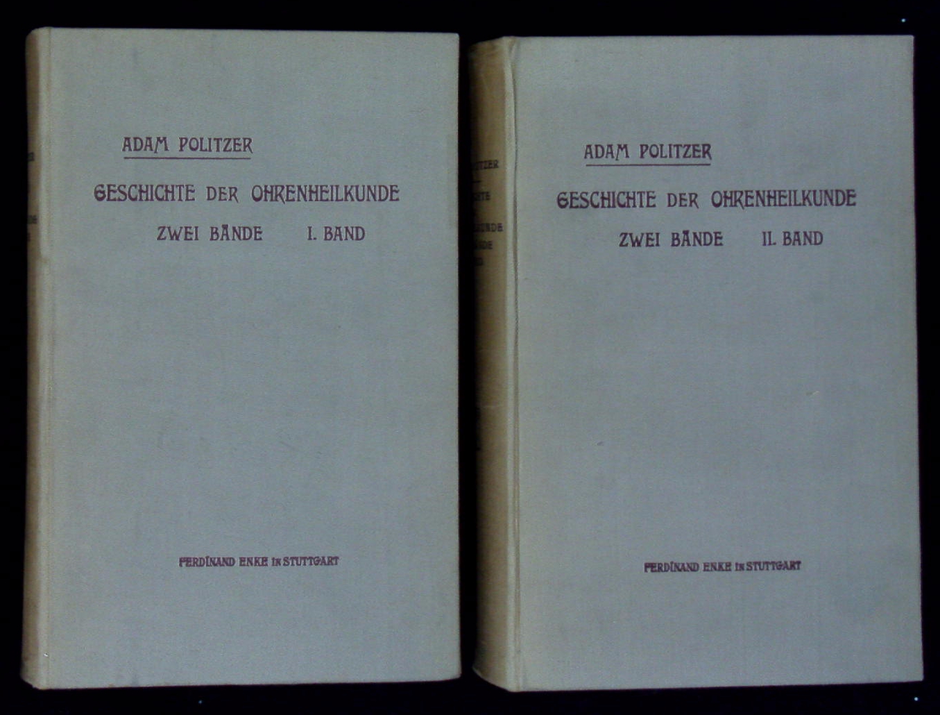 MEDIZIN.– POLITZER, Adam: Geschichte der Ohrenheilkunde. 2 Bände. Stuttgart (Enke), 1907-1913. Gr. 8°. XIV, 467, XVI, 884 S. mit 60 Bildtafeln und 19 Textabb. OLn. etwas bestaubt, kaum gelockert. EA des Standardwerks. „Politzer should have been the greatest historian of otology.“ (Garrison/Morton 3413)
